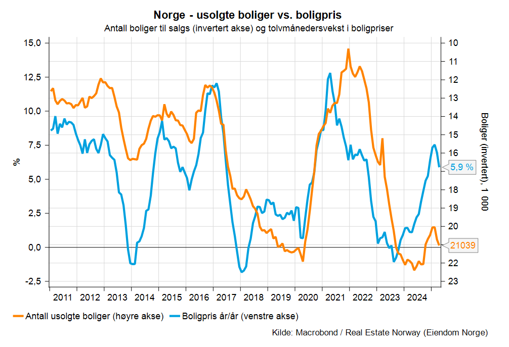 Bruktboligprisene nasjonalt var 5,9 prosent høyere i april enn på samme tid i fjor, og som figuren under viser har tolvmånedersendringen kommet seg litt ned sammenlignet med inngangen til 2025. Figuren viser også at antall usolgte boliger (måles ved invertert høyreakse) har steget litt gjennom årets første kvartal, og at nivået på antall usolgte boliger er ganske høyt sammenlignet med hva som har vært vanlig tidligere. Historisk har det også vært høy korrelasjon mellom disse to kurvene, men vi kan se at boligprisene har steget mer det siste året enn reduksjonen i usolgte boliger.