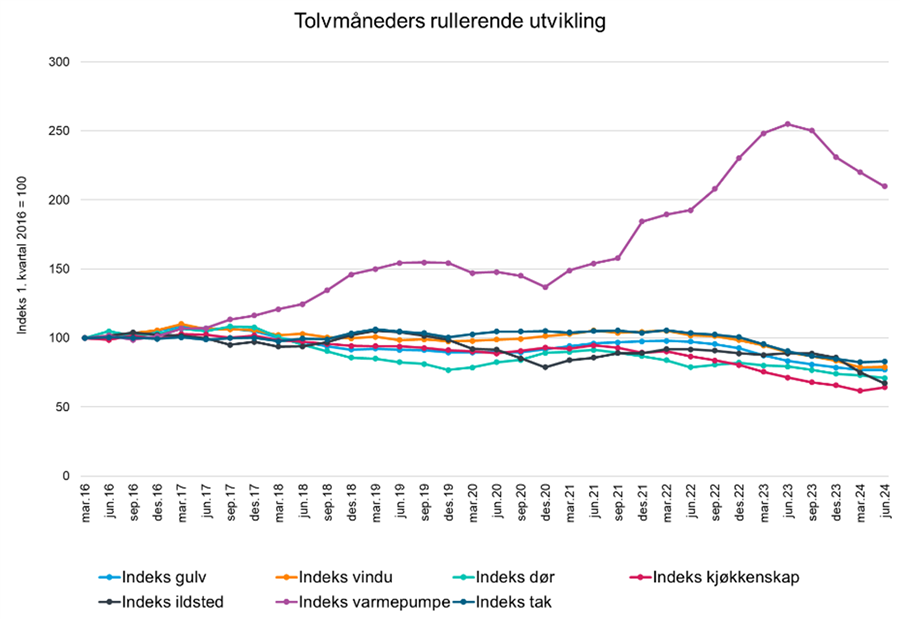 I denne artikkelen har vi valgt å se på tolvmåneders rullerende utvikling for gulv, vindu, dør, kjøkkenskap, ildsteder, varmepumper og tak fra 1. kvartal 2016 t.o.m. 2. kvartal 2024, målt i volum som vi får innrapportert fra aktørene i bransjen.