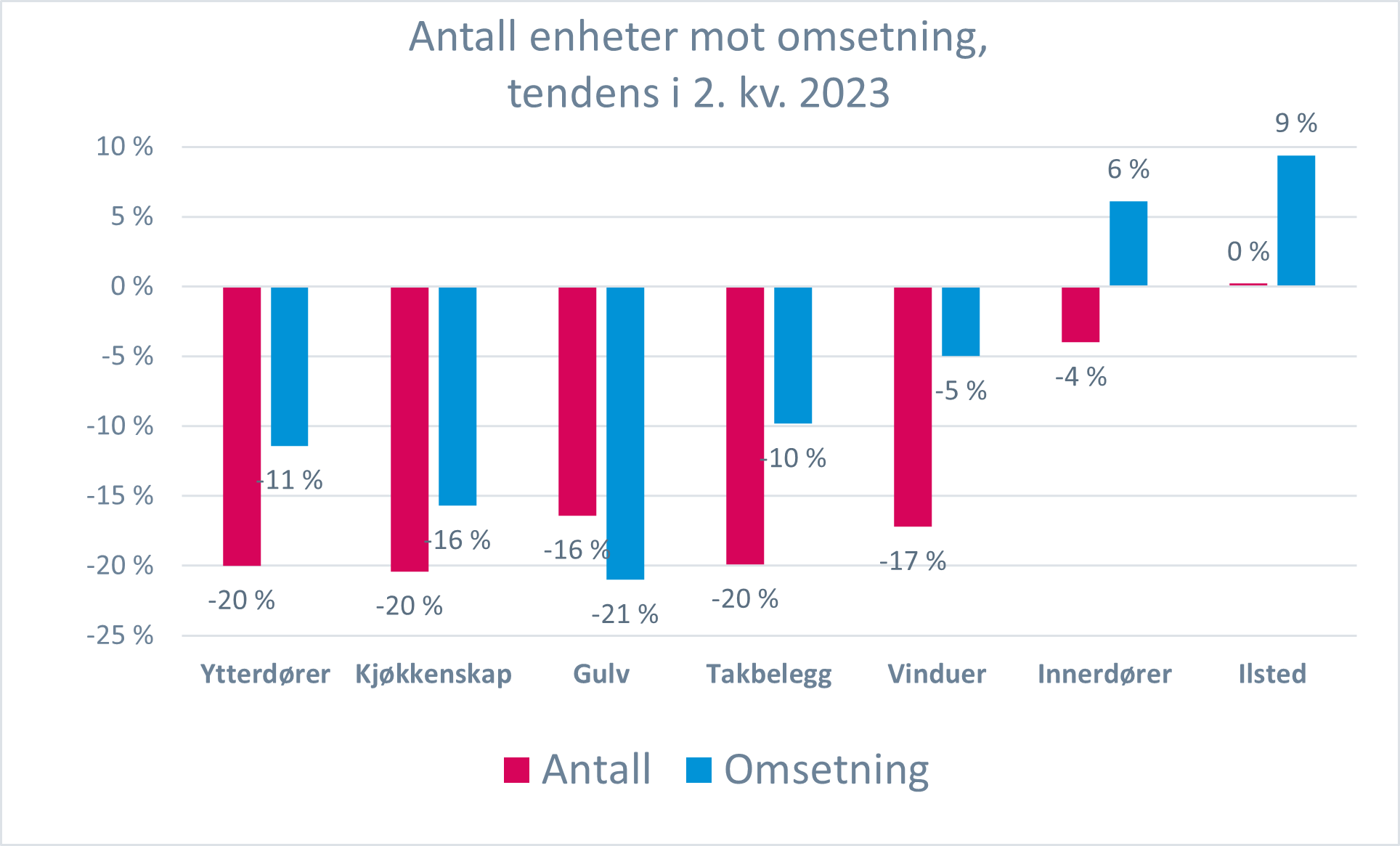 Vi ser samme tendens, altså sterkere volumfall enn omsetningsfall, på de andre eksemplene i grafen over, med unntak av gulvbelegg. Underlagstall der viser at årsaken til at omsetningen faller mer enn volumet er en vridning over på de rimeligere produktene som f.eks. laminatgulv.