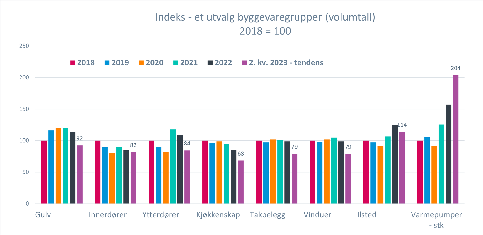 Grafen over viser tendens i volumutviklingen for et utvalg byggevarer akkumulert t.o.m. i 2.kvartal 2023, målt mot tilsvarende periode i 2022. For alle de utvalgte eksemplene, med unntak av varmepumper, peker pilene nå nedover og nedgangen har forsterket seg gjennom 2. kvartal. Igjen er den viktigste forklaringen nedgang i nybyggmarkedet for boliger. Når igangsettingen t.o.m. august er klar er det grunn til å forvente ytterligere volumnedgang for alle de omtalte produktgruppene. Varmepumper vil antagelig fortsatt være unntaket, til tross for at energiprisene nå ser ut til å legge seg på noe lavere nivåer enn vi har sett de siste par årene.