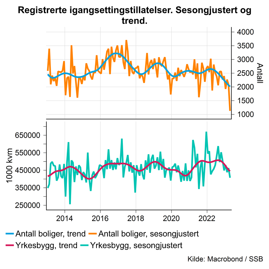 Det ble registrert igangsettingstillatelser til 1 107 nye boliger i april. Dette var 40 % lavere enn samme måned i 2022. April 2023 ligger 56 % under snittet for måneden de siste fem årene. Hittil i år har igangsettingen akkumulert økt mest i Oslo (+81 %) og Møre og Romsdal (+25 %). Lavest vekst i denne perioden var det i Troms og Finnmark og Viken med hhv. -57 og -47 %. Det er gitt tillatelser til 27 149 boliger de siste 12 mnd., som er 8 % under foregående ikke-overlappende 12 mnd. periode.