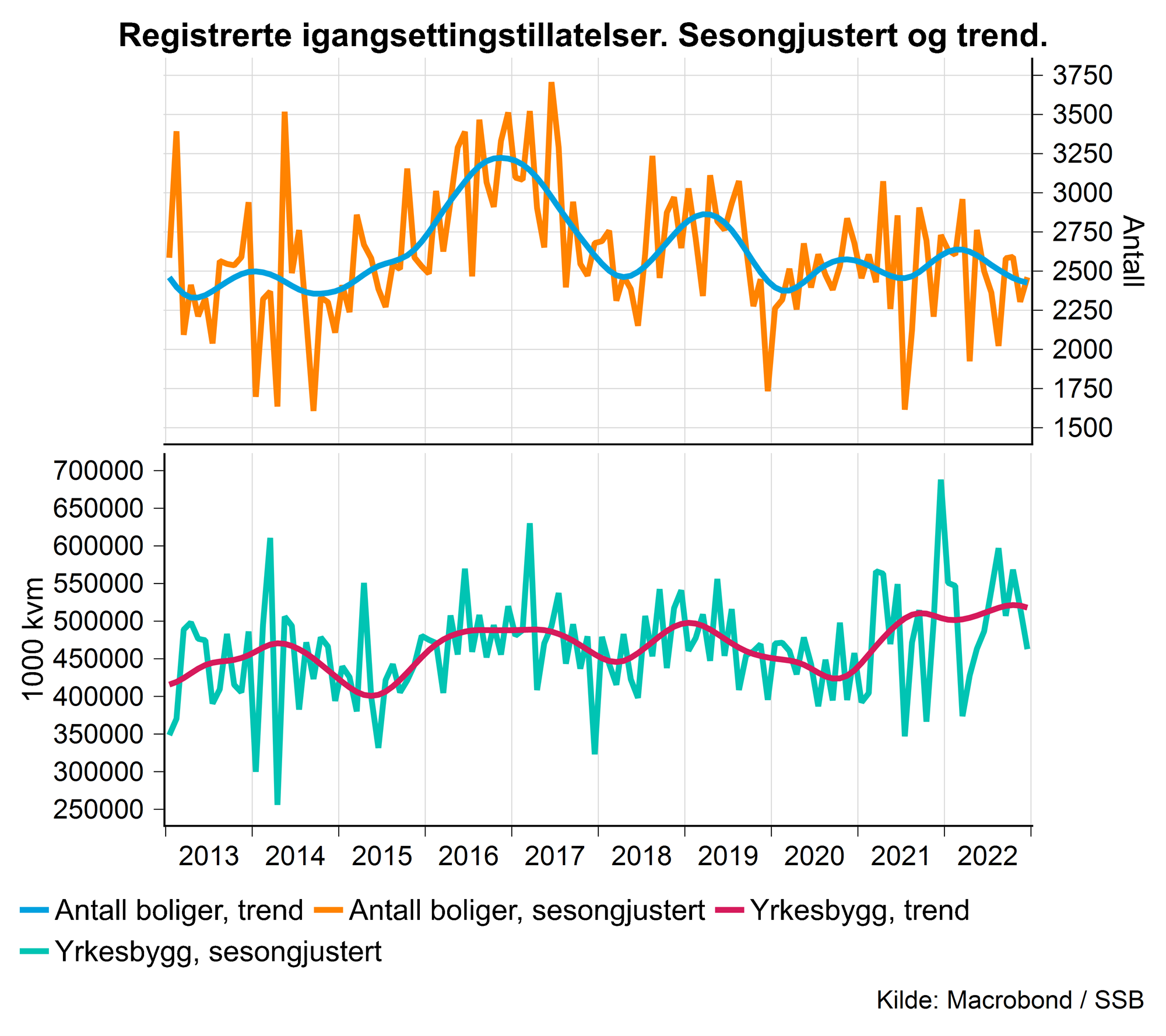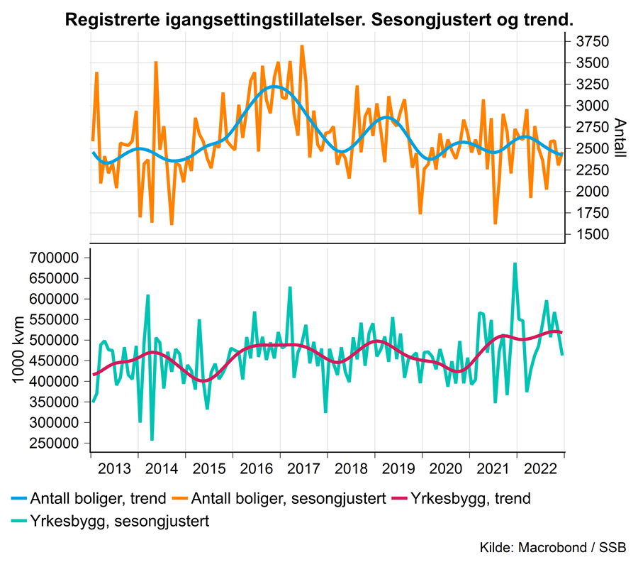 Det ble registrert tillatelser til 235’ kvm nytt yrkesbyggareal i desember. Det er 38 % lavere enn i samme måned i 2021 og 1 % lavere enn det som har vært vanlig for måneden siste fem år. I løpet av 2022 ble det registrert tillatelser til 4,03 mill. kvm, hele 15 % mer enn i 2021. Det har i løpet av høsten blitt registrert i hvert fall to store bygg som i realiteten ble igangsatt i 2021. Offentlige bygg endte i 2022 15 % under 2021 (målt i kvm), mens private næringsbygg endte 26 % over. Året endte langt mer positivt enn vår prognose fra september 2022, selv dersom vi tar hensyn til registreringsforsinkelsene. Det er uvanlig at igangsettingen øker så mye i et år med renteøkninger, høy inflasjon, stor usikkerhet og høye byggekostnader.