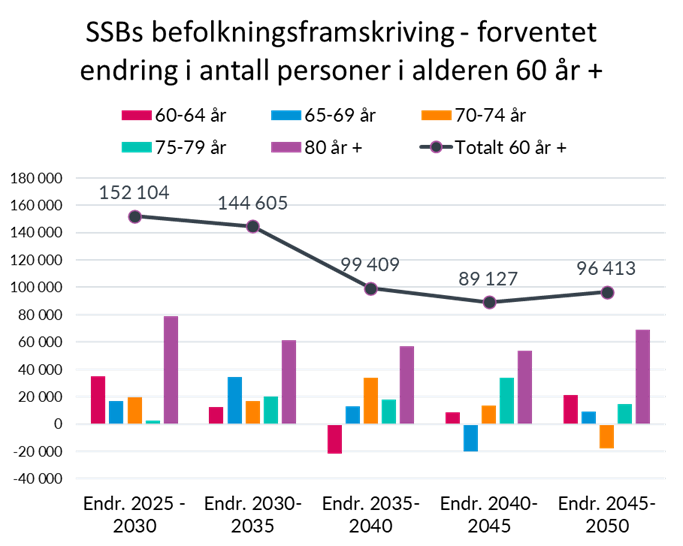 Et av de viktigste utgangspunktene i rapporten er utviklingen i befolkningens alderssammensetning. I løpet av de neste fem årene viser tall fra SSB at befolkningen over 60 år forventes å øke med mer enn 150 000 personer, tilsvarende en vekst på 11 prosent. Dette er på nivå med veksten vi har hatt de siste fem årene.