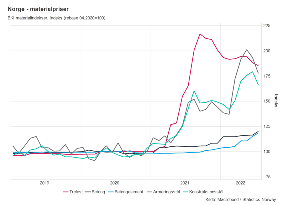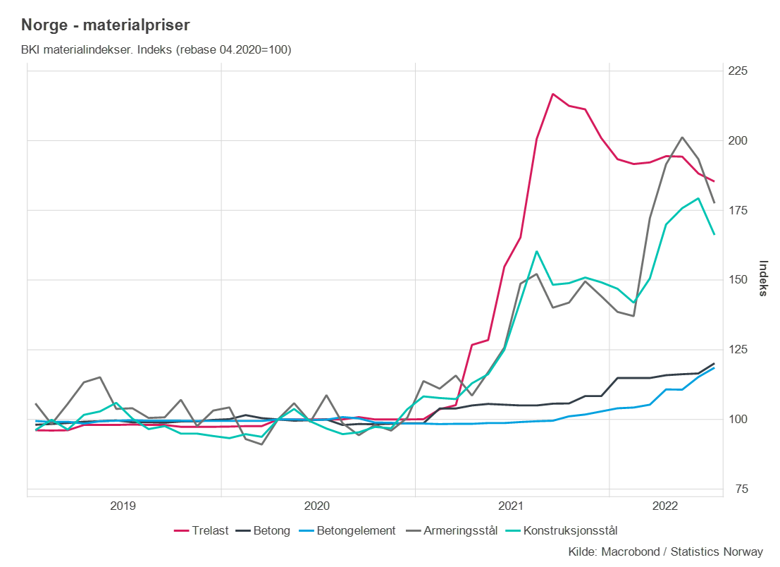 En del innsatsvarer til bygg vil bli billigere framover. Prisene på trelast og stål har allerede gått noe ned, men materialkostnadene i BKI for boliger er fortsatt 35-45 % høyere enn i 2019.