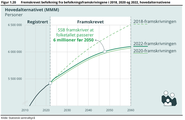 SSB oppdaterer befolkningsframskrivingen annethvert år, og i sommer kom det ny framskriving. «Den fremskrevne veksten i denne befolkningsframskrivingen er nær til den som ble publisert i juni 2020, som bortsett fra ad hoc-justeringer (COVID-19 i 2020-framskrivingen og krigen i Ukraina i årets framskriving) har relativt like forutsetninger på lengre sikt.», skriver SSB. I femårsperioden 2022-27 er befolkningsveksten nå ventet å bli totalt 25 711 personer høyere enn i 2020-framskrivingen, som tilsvarer 5142 personer i årlig gjennomsnitt i denne perioden. Det er hovedsakelig økt innvandring nå på kort sikt som forårsaker denne oppjusteringen av forventet befolkningsvekst.
