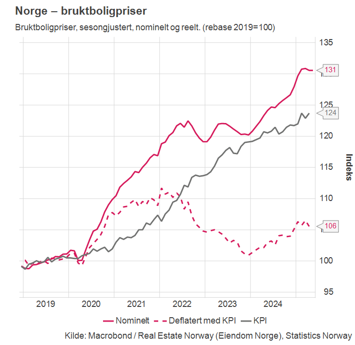 Ifølge boligprisindeksen til Eiendom Norge, FINN og Eiendomsverdi AS steg bruktboligprisene i Norge med 0,2 prosent i mai sammenlignet med måneden før. Korrigert for sesongvariasjoner var det ingen endring i boligprisene denne måneden. Boligprisveksten de siste 12 månedene er 5,2 prosent, mens konsumprisveksten i (nesten) samme periode er 2,5 prosent (tolvmånedersendringen i april, tall for mai publiseres 10. juni). Etter kontinuerlig fall i realboligprisene fra begynnelsen av 2022 til slutten av 2023, har realboligprisene steget igjen gjennom 2024 og flatet ut i første kvartal i år. Figuren under viser at realboligprisene fremdeles er lavere enn de var gjennom hele 2021 og store deler av 2022.