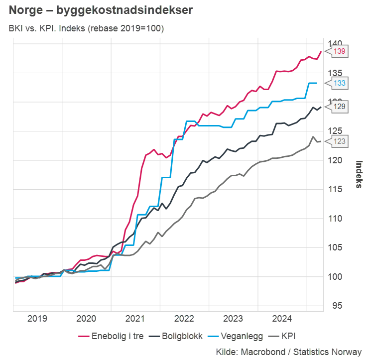 Mens de nominelle nasjonale bruktboligprisene nå er rundt 30 prosent høyere enn i 2019 (årsgjennomsnitt), viser figuren under at entreprenørenes byggekostnader har økt mer i den samme perioden. Eneboliger av tre har blitt nesten 40 prosent dyrere, mens veianlegg og boligblokker har hatt omtrent samme kostnadsvekst som økningen i bruktboligprisene siden 2019.