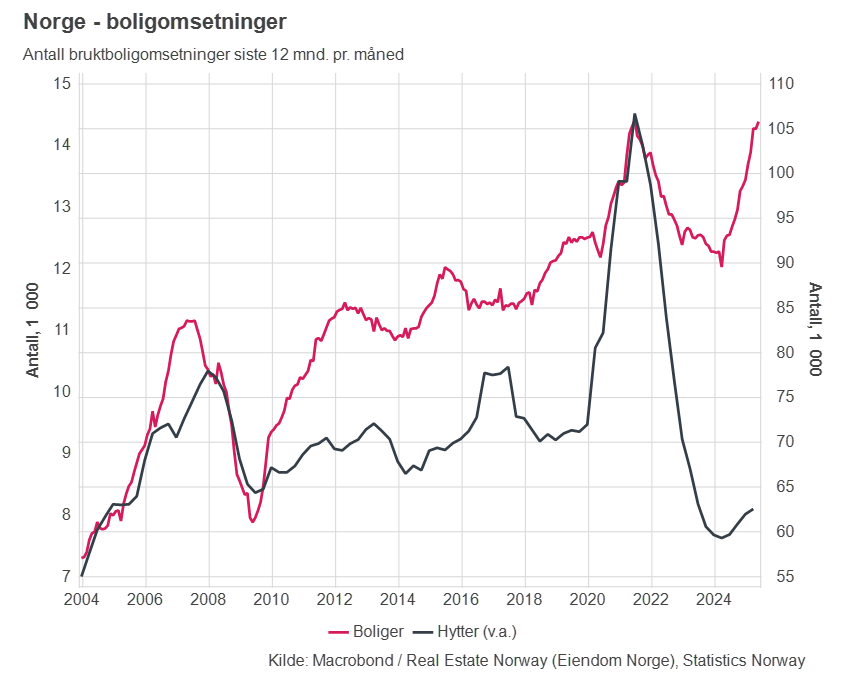 Ifølge Eiendom Norge, FINN og Eiendomsverdi har det hittil i år solgt drøyt 48.000 boliger, som er 16 prosent flere enn i fjor på samme tid. Samtidig er det hele 23 prosent høyere enn gjennomsnittet for siste ti år. Figuren under viser at den rullerende bruktboligomsetningen for siste 12 måneder nå så vidt har overgått forrige topp fra sommeren 2021. Figuren viser også hvordan hytteomsetningene har hatt en helt annen utvikling, med et omsetningsnivå siste 12 måneder milevis under pandemiboomen, men også lavere enn det har vært i alle år etter 2005.