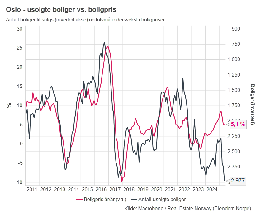 Det har historisk vært høyere korrelasjon mellom usolgte boliger og tolvmånedersveksten i boligprisene, både på landsbasis og i Oslo, enn det som har vært tilfellet siden sommeren 2023. I slutten av 2013 og 2017 var antallet usolgte boliger i Oslo nesten like høyt som nå, men da var tolvmånedersendringen i boligprisene negativ.