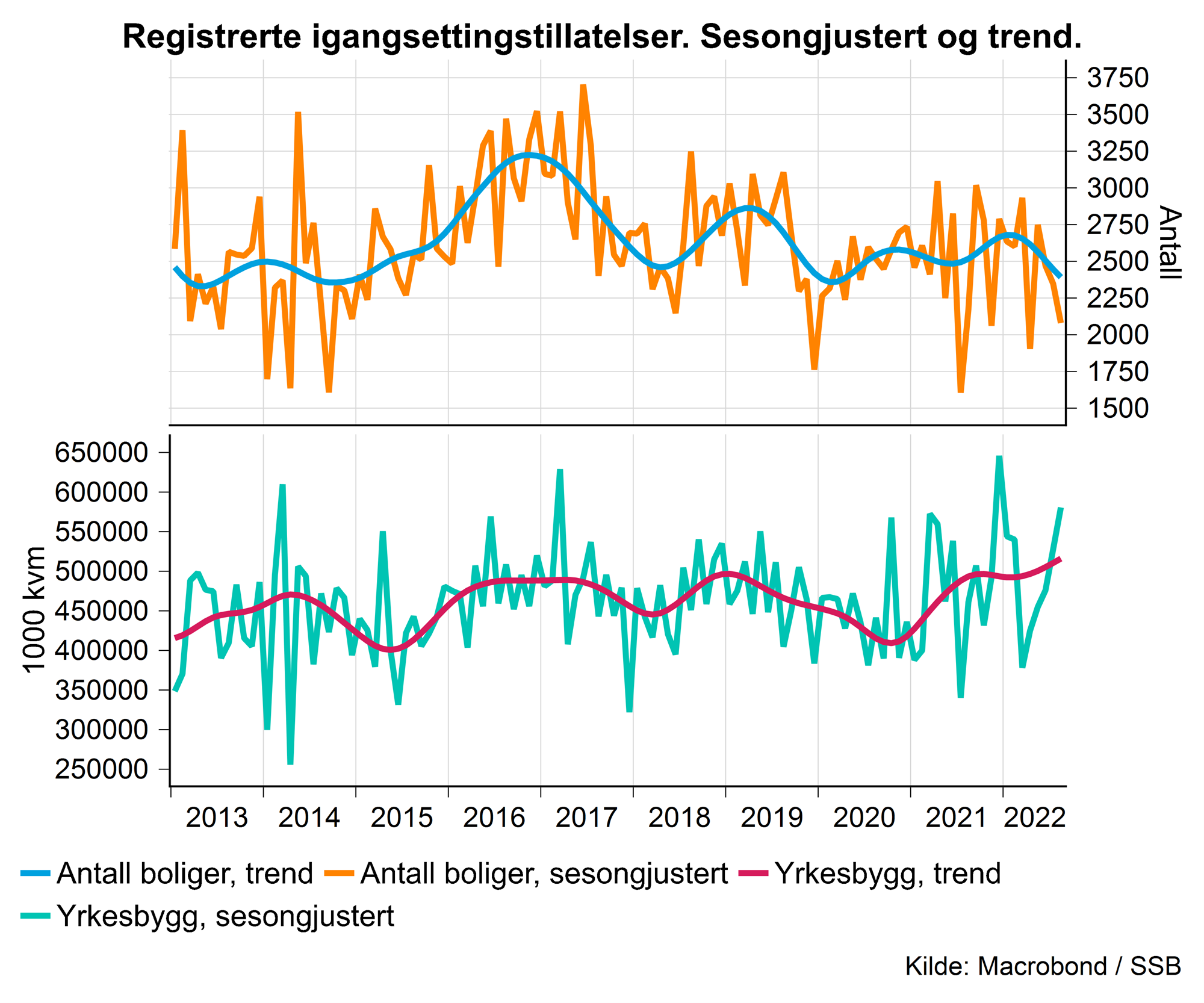 Det ble registrert tillatelser til 410’ kvm nytt yrkesbyggareal i august. Det er 53 % høyere enn i samme måned i 2021 og 90 % høyere enn det som har vært vanlig for måneden siste fem år. Hittil i år er det gitt tillatelser til 2,53 mill. kvm, 18 % over fjoråret på samme tid. Offentlige bygg er hittil i år 13 % bak 2021 (målt i kvm), mens private næringsbygg ligger 30 % foran. Siste 12 mnd. er det registrert 3,884 mill. kvm yrkesbyggareal totalt, som er en økning på 21 % fra foregående ikke-overlappende 12 mnd. periode.