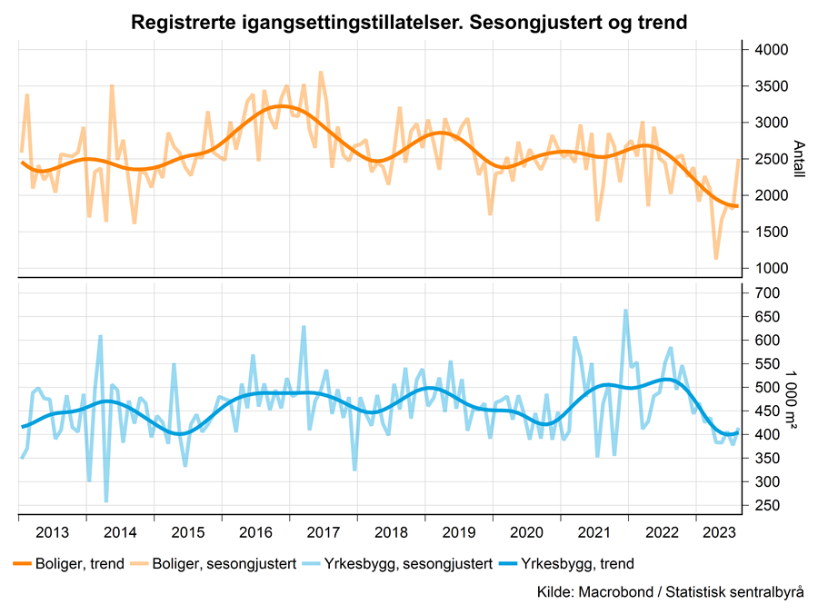 Det ble registrert igangsettingstillatelser til 1 942 nye boliger i august. Dette var 22 % høyere enn samme måned i 2022. August 2023 ligger fremdeles 13 % under snittet for måneden de siste fem årene. Hittil i år har igangsettingen akkumulert økt mest i Oslo (+84 %) og Møre og Romsdal (+11 %). Lavest vekst i denne perioden var det i Viken og Nordland med hhv. -45 og -41 %. Det er gitt tillatelser til 24 994 boliger de siste 12 mnd., som er 18 % under foregående ikke-overlappende 12 mnd. periode. Månedsstatistikk svinger mye og august i år mot i fjor viser større variasjon enn normalt.