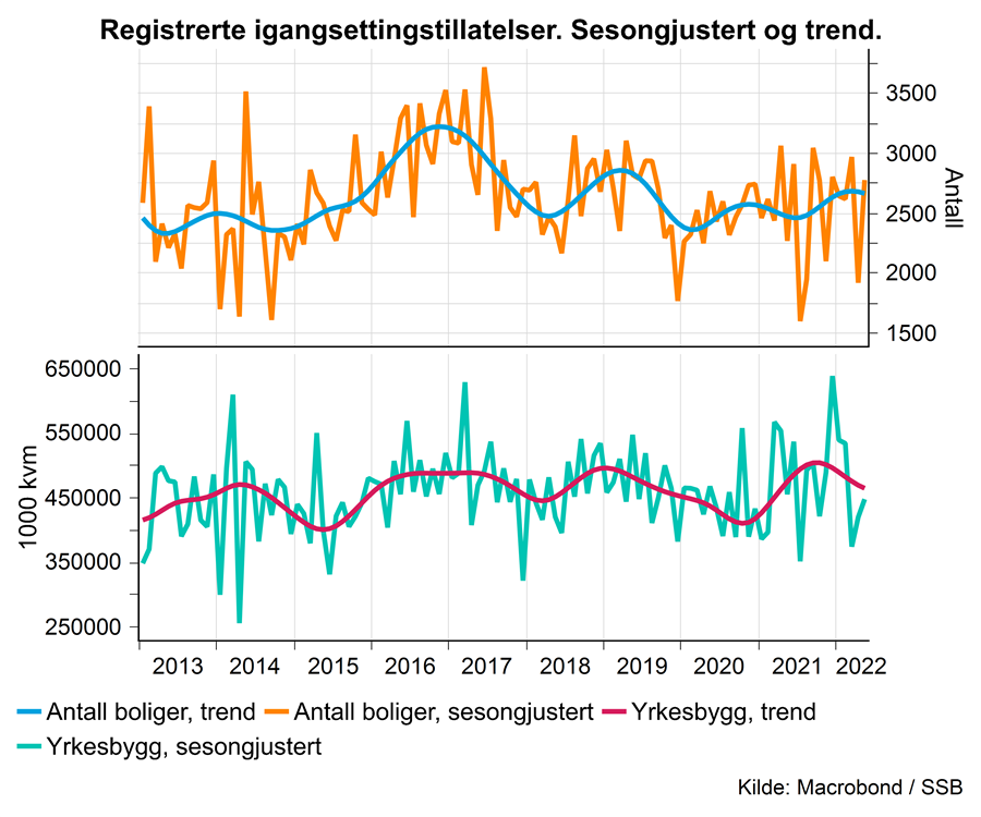 Det ble registrert igangsettingstillatelser til 2 691 nye boliger i mai. Dette var 23 % høyere enn samme måned i 2021, og 13 % over snittet for måneden de siste fem årene. Hittil i år er det gitt tillatelser til 12 578 boliger, som er 2 % flere enn på samme tid i 2021. Siste 12 mnd. er det gitt tillatelser til 30 072 boliger, som er 2 % under foregående ikke-overlappende 12 mnd. periode. Vi venter at den rullerende 12-mnd.-igangsettingen skal ned fremover blant annet på grunn av økte byggekostnader og økt usikkerhet.