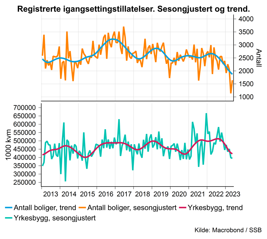 Det ble registrert igangsettingstillatelser til 1 515 nye boliger i mai. Dette var 44 % lavere enn samme måned i 2022, og 38 % under snittet for måneden de siste fem årene. Hittil i år har igangsettingen økt i Oslo (+73 %) og Møre og Romsdal (+13 %), mens det har vært nedgang de andre fylkene, og aller mest i Viken og Troms og Finnmark med hhv. -51 og -46 %. Det er gitt tillatelser til 25 973 boliger de siste 12 mnd., som er 14 % under foregående ikke-overlappende 12 mnd. periode.