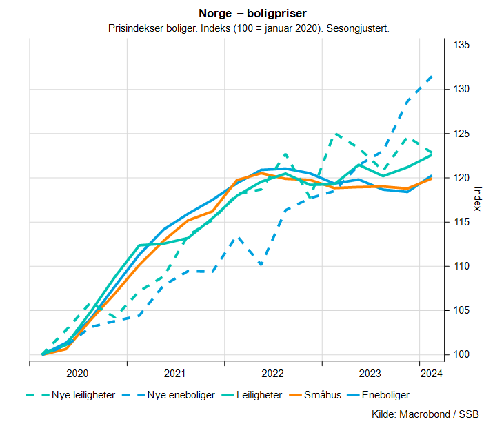 Figuren over viser både SSBs prisindeks for nye boliger og brukte boliger fordelt på boligtyper. Både ujustert og sesongjustert indeks viser at nye boliger har steget veldig mye mer i pris enn brukte de siste par årene, og spesielt nye eneboliger. Den sterke byggekostnadsveksten forklarer i stor grad dette. Prisene på nye blokkleiligheter og småhus gikk ned med 1,6 prosent fra første kvartal 2023 til samme kvartal i 2024, mens nye eneboliger hadde en prisvekst på hele 11 prosent i denne perioden. En viktig presisering fra SSB er at prisene på nye eneboliger og nye flerboliger innhentes på forskjellige tidspunkt i byggeprosessen. Eneboliger måles når de tinglyses (altså ved overtagelse), mens flerboliger måles på salgstidspunktet.