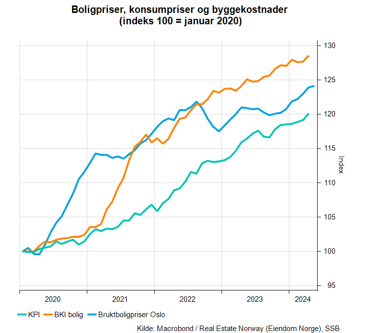 Sammenligner vi f.eks. utviklingen i bruktboligpriser i Oslo med konsumprisene og byggekostnadene, viser figuren under at byggekostnadene har steget betydelig mer enn bruktboligprisene i Oslo siden 2020. Setter man startåret til 2022 i stedet, kommer det frem at både konsumprisene og byggekostnadene har steget mer enn bruktboligprisene i Oslo har gjort i perioden.