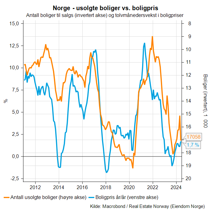 Bruktboligtilbudet har tatt seg betydelig opp siden begynnelsen av 2022, og nå igjen spesielt siste måneden. I figuren under ser vi sammenhengen mellom tolvmånedersendringen i Eiendom Norges nasjonale bruktboligprisindeks (leses av på venstre akse) og antall bruktboliger til salgs (leses av på invertert høyre akse). Begge indeksene er sesongjustert. Ikke overraskende er det en tydelig sammenheng mellom boliger til salgs og prisutviklingen. Fortsetter bruktboligtilbudet å øke utover sommeren og høsten, er det ikke lange veien ned til null eller en negativ tolvmånedersendring i bruktboligprisene.
