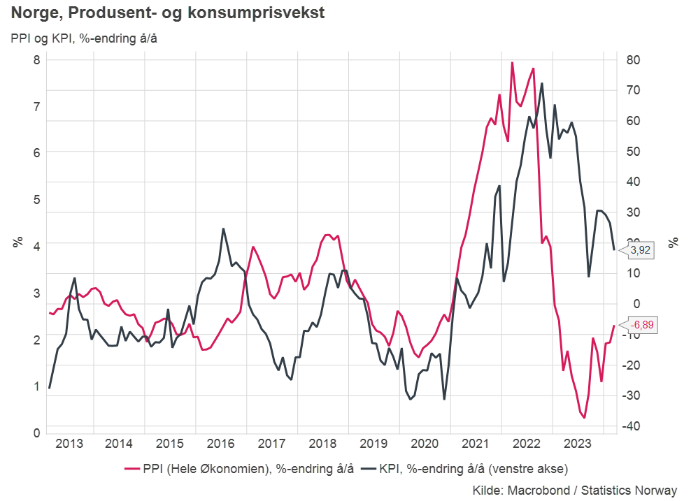 SSB publiserte også produsentprisindeksen (PPI) for mars, som viser at produsentprisene var nesten 7 prosent lavere i mars enn samme måned i fjor. Denne indeksen har hatt et kraftig fall fra august 2022 da tolvmånedersveksten var på hele 77 prosent til bunnen på -37 prosent i august 2023. Etter i fjor sommer har produsentprisene fortsatt å falle, men fallet i seg selv avtar gradvis. Det er god korrelasjon mellom PPI og KPI, og førstnevnte har historisk vært en god indikator på fremtidig utvikling i sistnevnte. Vi forventer at konsumprisene vil fortsette å avta gradvis fremover, men det er et par skjær i sjøen.