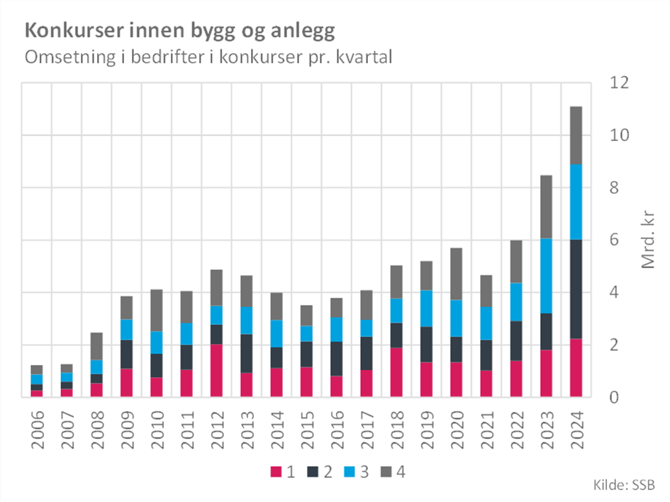 – Altså er det ikke noe unormalt med antallet bedrifter som går konkurs, det som er helt uvanlig er størrelsen på omsetningen på de bedriftene som går konkurs (se figur under). Målt i omsetning, ligger spesielt 2024 (men også 2023) skyhøyt over det som var vanlig før. Det betyr at det kan bli mindre konkurranse om de større oppdragene etter hvert når aktiviteten i næringen tar seg opp igjen. Likevel forventer vi at det høye rentenivået og byggekostnadene vil holde etterspørselen nede slik at det ikke blir kapasitetsproblemer med det første.
