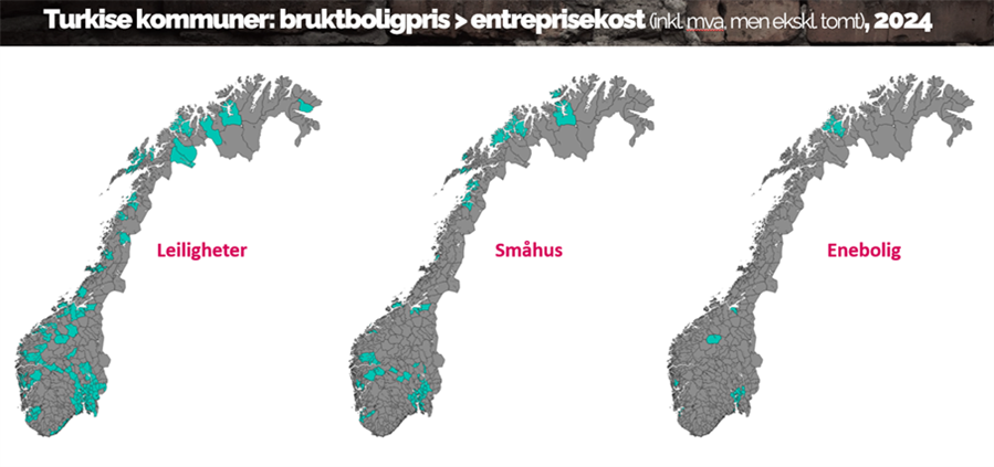 – Vi gjorde nylig en sammenligning og visualisering av bruktboligpriser og entreprisekostnader per kvadratmeter på kommunenivå og fordelt på boligtyper for å se på forskjellene i lønnsomhet. I kartene under er ikke tomtekostnader med. Hadde vi inkludert det også, ville det vært svært få kommuner der det fremdeles er lønnsomt å bygge.