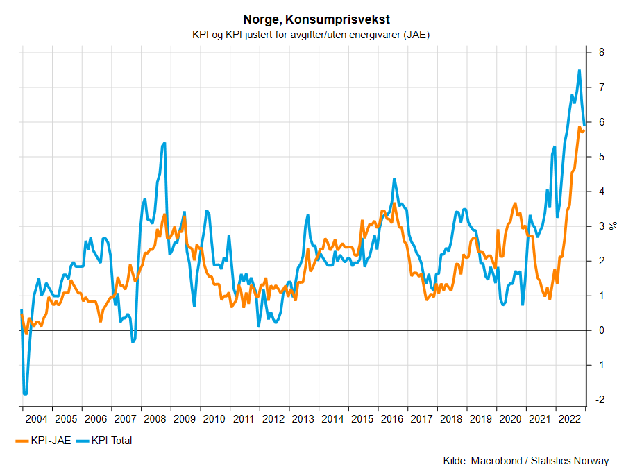 KPI justert for avgiftsendringer og uten energivarer (KPI-JAE) var 5,8 % høyere i desember 2022 enn samme måned året før. Dette var en marginal økning i tolvmånedersveksten fra måneden før, og marginalt under den foreløpige toppen fra oktober.