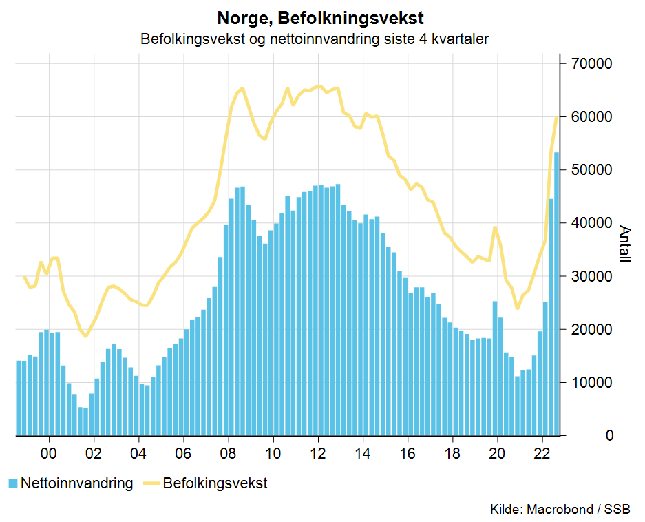 Etter nesten ti år med fallende befolkningsvekst, drevet av en fallende nettoinnvandring, vil befolkningsveksten i år nærme seg gamle høyder fra årene 2012-13. Den gangen var det sterk vekst i arbeidsinnvandringen, etter at Polen ble EU-medlemmer i 2004 og en del av Schengenområdet i 2007. Men i årene etter 2013 snudde utviklingen, og igjen var det spesielt arbeidsinnvandringen fra Øst-Europa som påvirket befolkningsveksten i Norge. Den norske kronen svekket seg, og arbeidsinnvandrerne fikk lønnen sin målt i hjemlandets valuta betydelig svekket. Ikke minst hadde det mye å si at flere av de østeuropeiske økonomiene blomstret.