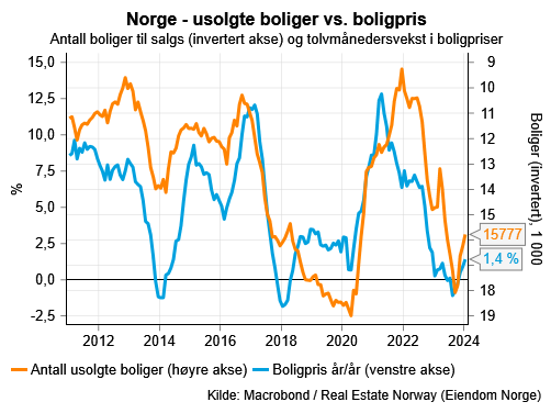 Det som fremdeles styrker utviklingen i boligmarkedet er den lave arbeidsledigheten. Boligetterspørselen i januar var så høy at antallet usolgte boliger (boliger tilgjengelig for salg) falt fordi det ble solgt flere boliger enn det ble lagt ut. Den sterke tilbudssiden som bygget seg opp gjennom høsten kan se ut til å bygges ned i årets første måned. Likevel venter vi fremdeles at en del av boligene som ble trukket fra markedet usolgt i november og desember kan bli forsøkt solgt i februar. I kombinasjon med at renteøkningen fra desember vil merkes i husholdningenes nettbank først i februar, kan det resultere i en svak utvikling for resten av første kvartal.