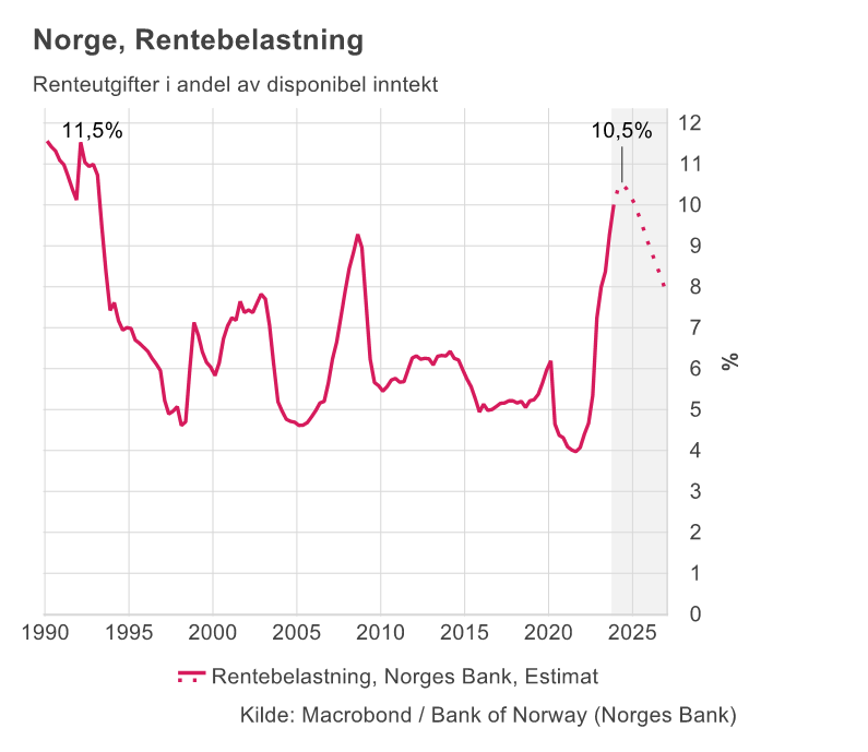 Den sterke veksten på 5,9 prosent i årets første kvartal er svært overraskende tatt i betraktning at nordmenns renteutgifter målt som andel av disponibel inntekt er på sitt høyeste siden tidlig 90-tall. Vi har tidligere ramset opp ulike hypoteser og forklaringer på hvorfor situasjonen er sånn. Stadig flere trekker frem viktigheten av at rentetoppen er nådd som en forklaring på den sterke boligprisveksten. Vi er enig i at husholdningenes renteforventninger er en viktig forklaringsvariabel, men det er også godt mulig at husholdningene tolker denne rentetoppen litt for optimistisk. Det ligger an til at norske husholdninger fremdeles kommer til å ha dobbelt så høye renteutgifter (målt som andel av disponibel inntekt) i 2026 som de hadde i 2021, selv etter en rekke rentekutt i årene fremover.