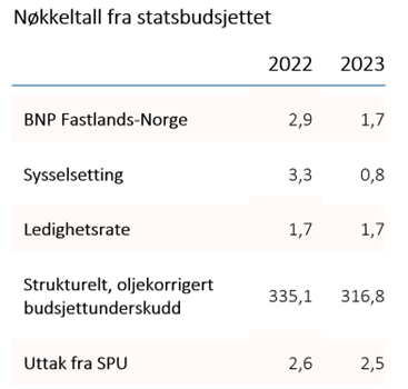 Videre tegner Finansdepartementet et veldig positivt og optimistisk bilde av arbeidsmarkedet neste år, der de forventer at sysselsettingen øker med 0,8 %, etter veldig sterk vekst i år, og at arbeidsledigheten holder seg uendret fra i år til 2023. Disse prognosene er mer optimistiske enn både SSB og Norges bank sine, og de er noe overraskende tatt i betraktning de planlagte økte utgiftene for næringslivet neste år. NHO har beregnet at de foreslåtte skatteøkningene til bedriftene er på 47 mrd. kr. Dette og mye annet taler for at arbeidsledigheten vil øke litt neste år.
