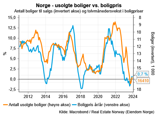 Fjoråret endte med omtrent 15 600 usolgte boliger (eller boliger tilgjengelig for salg) i desember ifølge Eiendom Norge. Dette er omtrent 36 prosent over det historiske gjennomsnittet de siste 10 årene, men dette gjennomsnittet blir betydelig trukket ned av de to pandemiårene 2020 og 2021, da det var et svært lavt tilbud i desember måned. Antallet usolgte boliger har avtatt en del i årets siste to måneder. Det kan være fordi selgere i dagens marked ikke oppnår den ønskede prisantydningen, og derfor velger å avstå fra å selge fremfor å redusere prisen. Dersom disse boligene blir tilgjengelig på markedet igjen i løpet av våren, kan en høy tilbudsside og svak etterspørselsside resultere i en negativ utvikling.