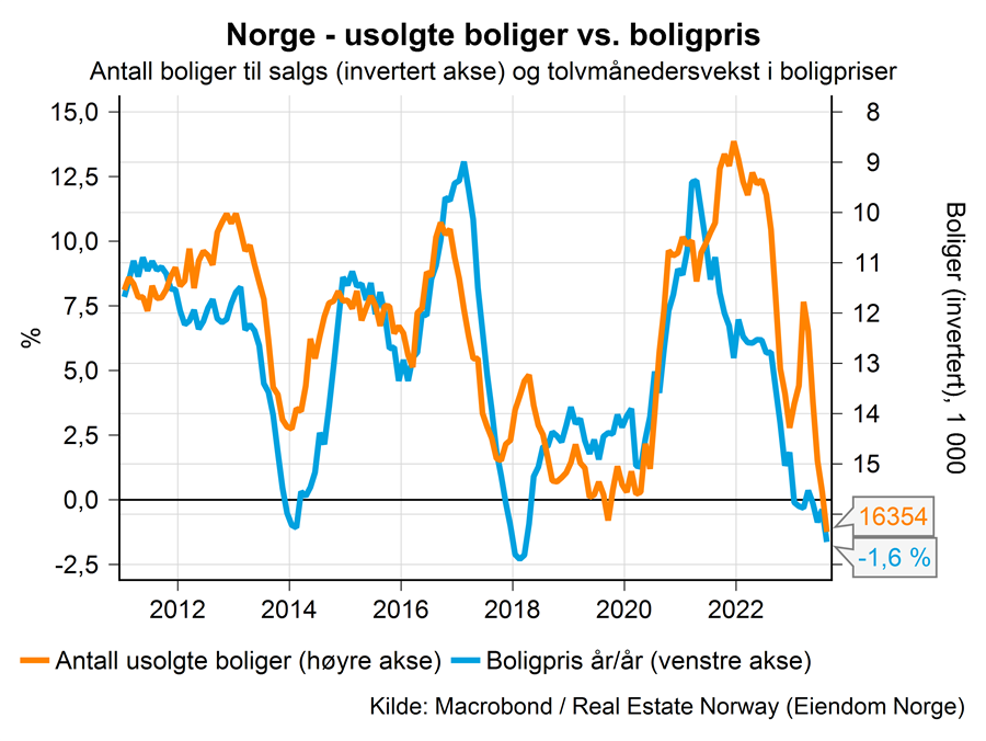 Den høye renten har også påvirket tilbudssiden i boligmarkedet, der antall usolgte boliger (antall boliger tilgjengelig for salg) er på et historisk høyt nivå. I august var det 15 prosent flere usolgte boliger enn det historiske gjennomsnittet. En høy tilbudsside svekker balansen i boligmarkedet med en fallende etterspørsel.