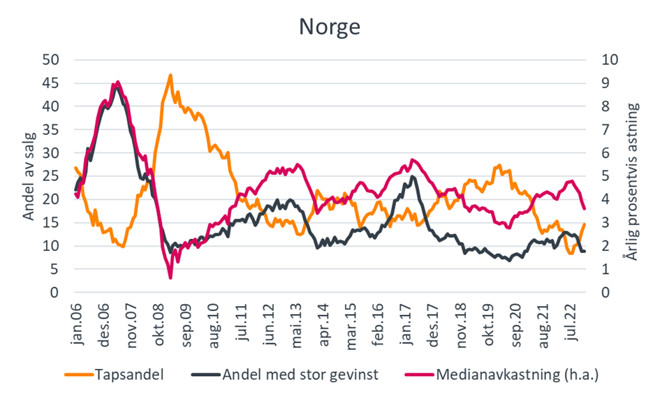 Ferske tall for desember 2022 viser at tapsandelen nasjonalt var 13 % denne måneden, som er omtrent uendret fra samme måned i 2021. Her gjengir månedene når salget ble tinglyst, altså når det var overtakelse. Boligene kan ha blitt kjøpt når som helst tidligere, men vi ser at de fleste tinglysninger skjer 2-3 måneder etter budaksept. Ser vi på fjoråret som helhet, var tapsandelen nasjonalt 11 %, som var en nedgang fra 16 % i 2021. I andre enden av skalaen finner vi at 9 % av salgene i desember fikk mer enn 10 % årlig avkastning i perioden de var eid (definert som «stor gevinst»), en liten nedgang fra 11 % i samme måned i 2021. Fjoråret som helhet resulterte i at 12 % av boligsalgene nasjonalt endte med stor gevinst, marginalt høyere andel enn i 2021.