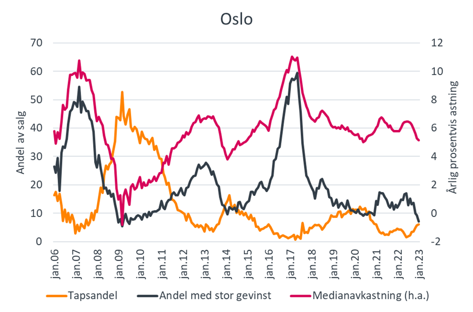 På grunn av transaksjonskostnadene, fører flat prisutvikling til at salg havner i tapsbunken. Prisfallet gjennom høsten i fjor vil prege tinglysningene i begynnelsen av inneværende år, og gjennom 2023 får vi i beste fall flat prisutvikling. Mest sannsynlig en svak prisnedgang. Fremover vil tapsandelen uten tvil stige igjen, men det er lite som tyder på at den skal stige like mye som under finanskrisen.