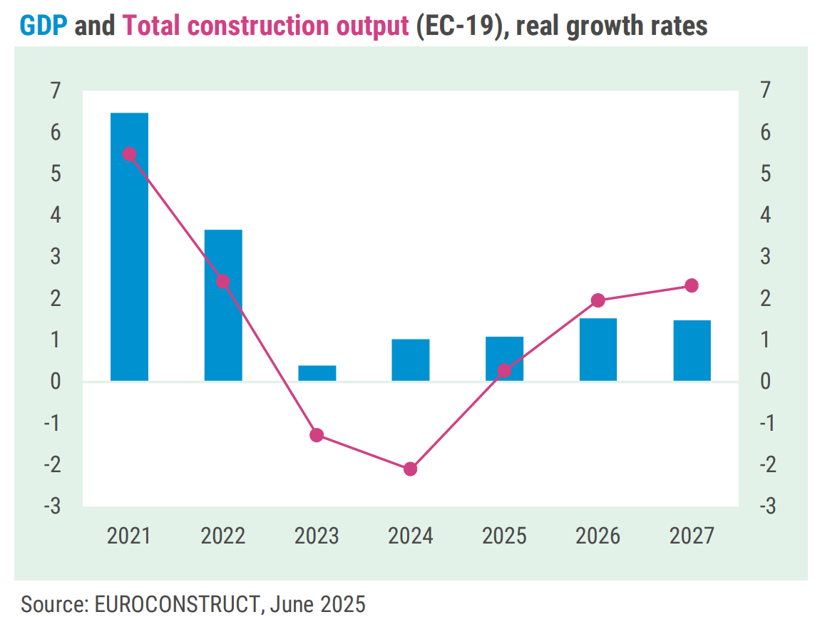 Etter flere år med store svingninger, står det europeiske bygge- og anleggsmarkedet foran en forsiktig oppgang. Det viser prognoser presentert på EUROCONSTRUCT-konferansen i Warszawa 6. juni 2025.