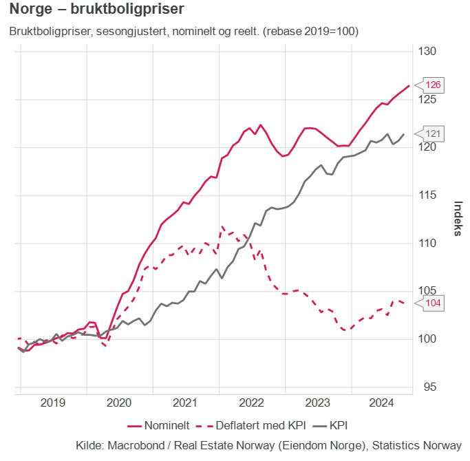 Ifølge boligprisindeksen til Eiendom Norge, FINN og Eiendomsverdi AS falt bruktboligprisene i Norge med 0,5 prosent i november sammenlignet med måneden før. Korrigert for sesongvariasjoner steg boligprisene med 0,4 prosent denne måneden. Boligprisveksten de siste 12 månedene er 5,2 prosent, mens konsumprisveksten i (nesten) samme periode er 2,6 prosent (tolvmånedersendringen i oktober, tall for november har ikke kommet enda). Etter kontinuerlig fall i realboligprisene fra begynnelsen av 2022 til slutten av 2023, har realboligprisene steget forsiktig igjen med et par prosentpoeng gjennom 2024.