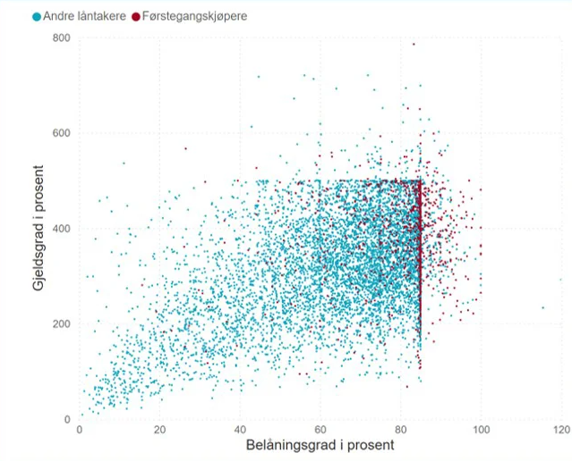 Figuren under er fra Finanstilsynets Boliglånsundersøkelse 2024, og viser nye nedbetalingslån i 2024 etter gjeldsgrad og belåningsgrad. Figuren viser at det er flest førstegangskjøpere blant låntakerne som har høyere belåningsgrad enn 85 prosent. Neste år vil vi trolig se en stor oppsamling av låntakere på 90-markøren på den vannrette aksen. Ifølge Finanstilsynet har 22 prosent av nye boliglån til førstegangskjøpere i år en belåningsgrad over 85 prosent.
